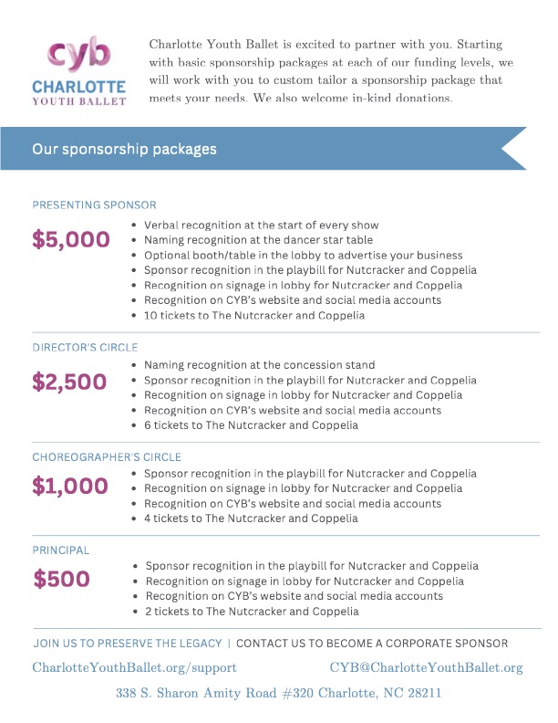 For questions about which sponsorship is right for your business, email giving@charlotteyouthballet.org.